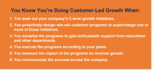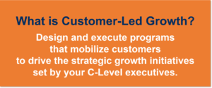 Customer-Led Growth is when you conceive of, design, and execute programs that mobilize your customers to drive the strategic growth initiatives that have been set by your C-Level executives.